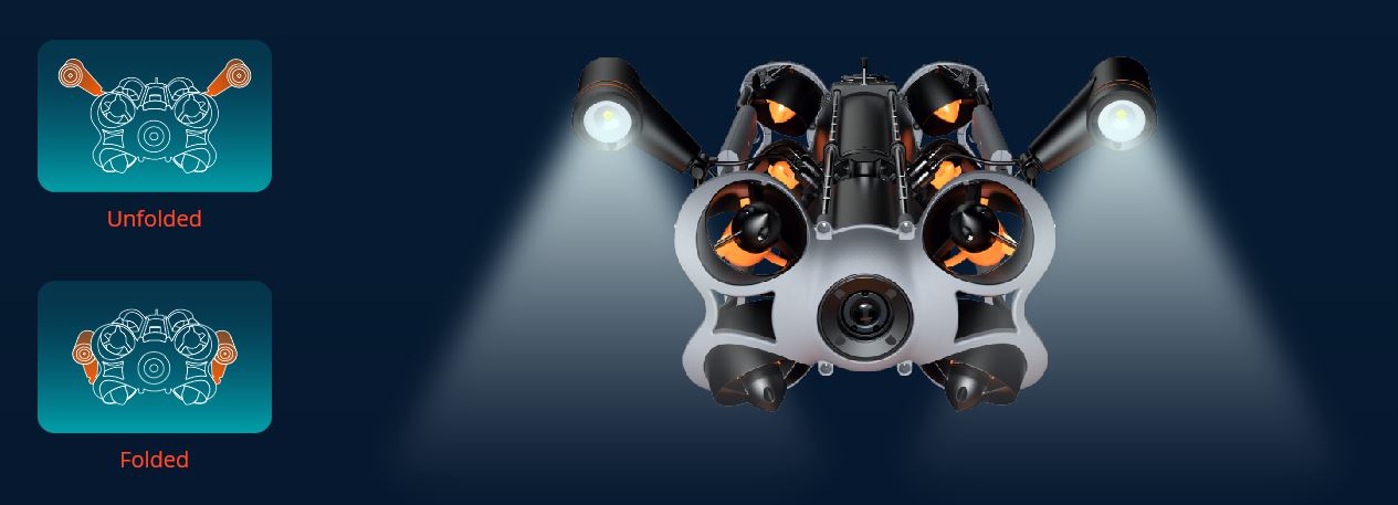 With the external 8,000 lumen LED floodlights, the dual light source has a 150° best beam angle, which can be folded flexibly to effectively solve the visual interference caused by the reflection of plankton, and 0-100% stepless adjustment of the light brightness can illuminate every detail.
