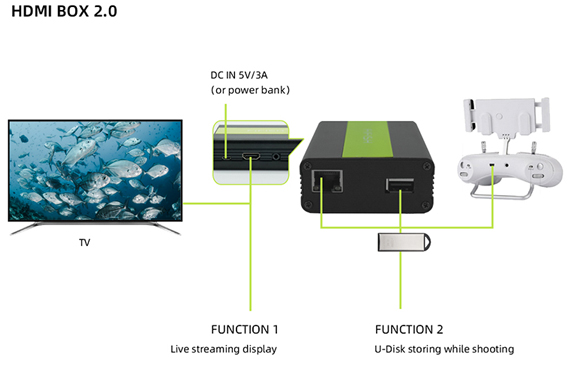 Connect this HDMI box to your controller to broadcast your underwater images live through your social media platforms or to a TV.